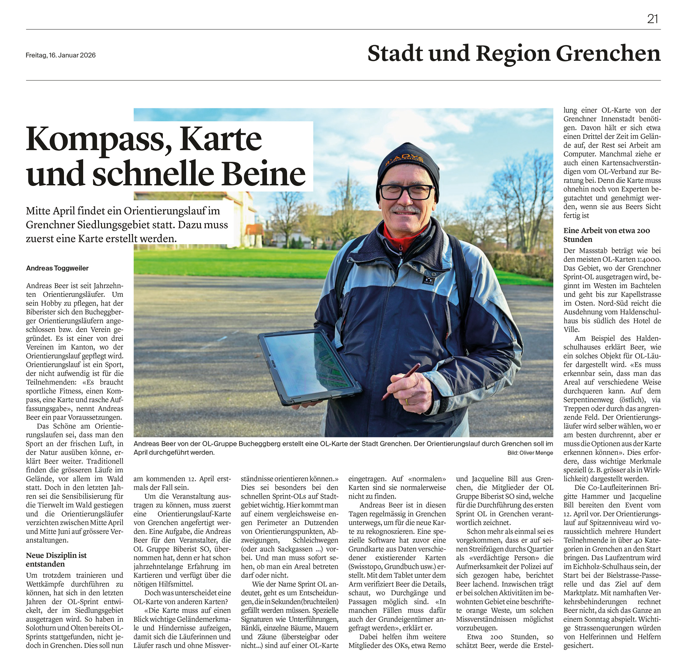 Mitte Januar erschien über Andy in der Solothurner Zeitung ein schöner Bericht zur Neuerstellung der Grenchener «Stadt-Sprint-OL-Karte» für den Biberister OL im Frühling 2026. Zusätzlich zu dieser Karte ist er zurzeit mit der Überarbeitung von unserer Lerchenberg-Ost Karte beschäftigt, die wir dann für unseren regionalen OL im April einsetzen werden. Dazu laufen auch schon die Vorbereitungen auf den BOL-2027 für den die Karte «Flüeli-Eggholz» komplett überarbeitet werden muss.