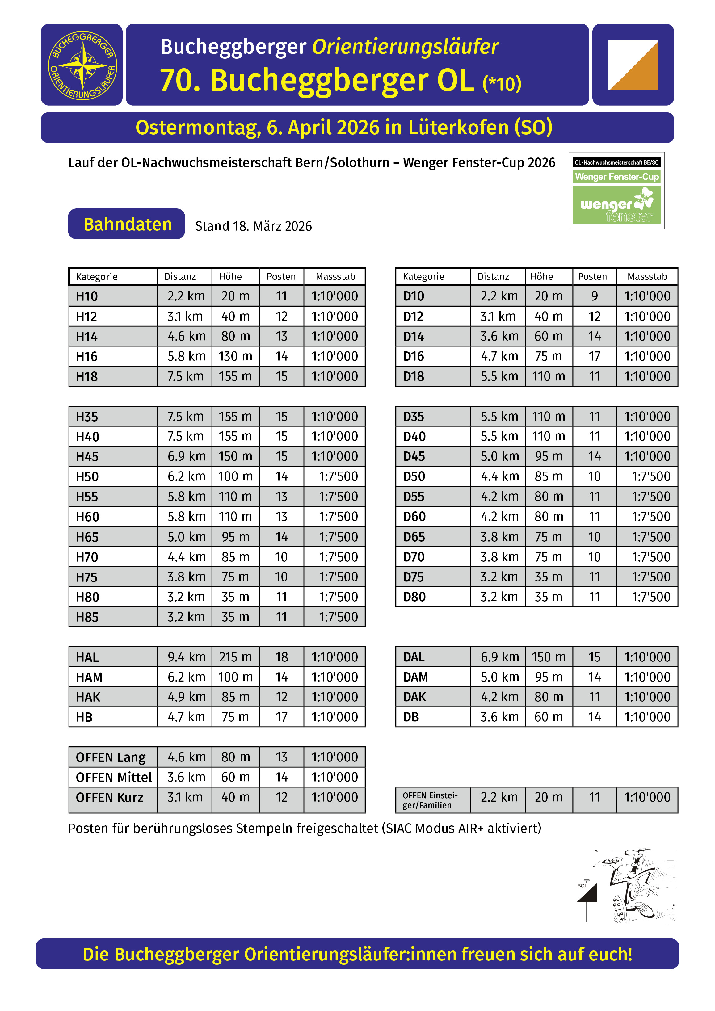 Schon bald ist es soweit…am Ostermontag, 6. April organisieren wir den 70. Bucheggberger OL in Lüterkofen (SO). Der Lauf ist Teil der OL-Nachwuchsmeisterschaft BE/SO, dem «Wenger-Fenster-Cup 2026».