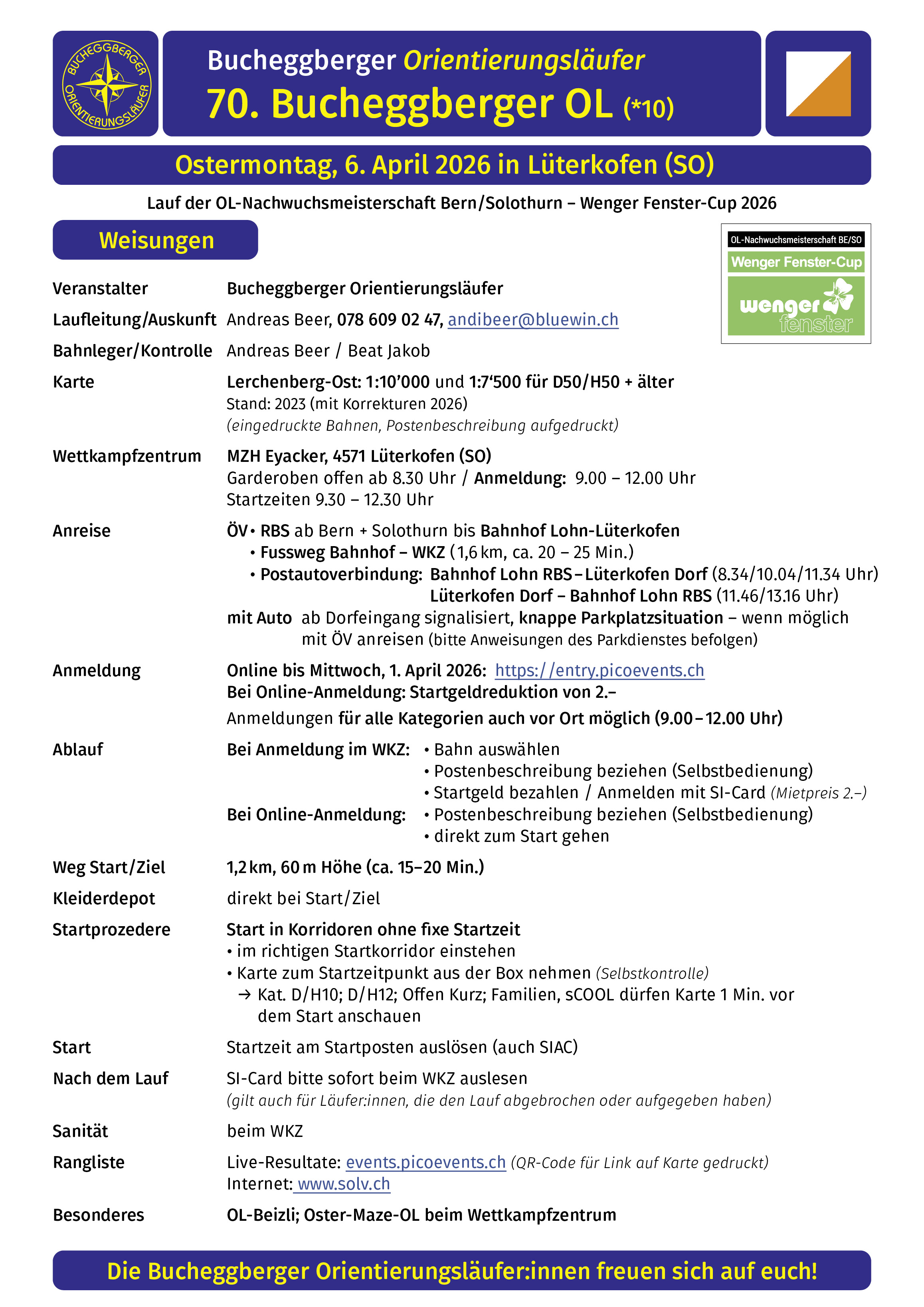 Schon bald ist es soweit…am Ostermontag, 6. April organisieren wir den 70. Bucheggberger OL in Lüterkofen (SO). Der Lauf ist Teil der OL-Nachwuchsmeisterschaft BE/SO, dem «Wenger-Fenster-Cup 2026».