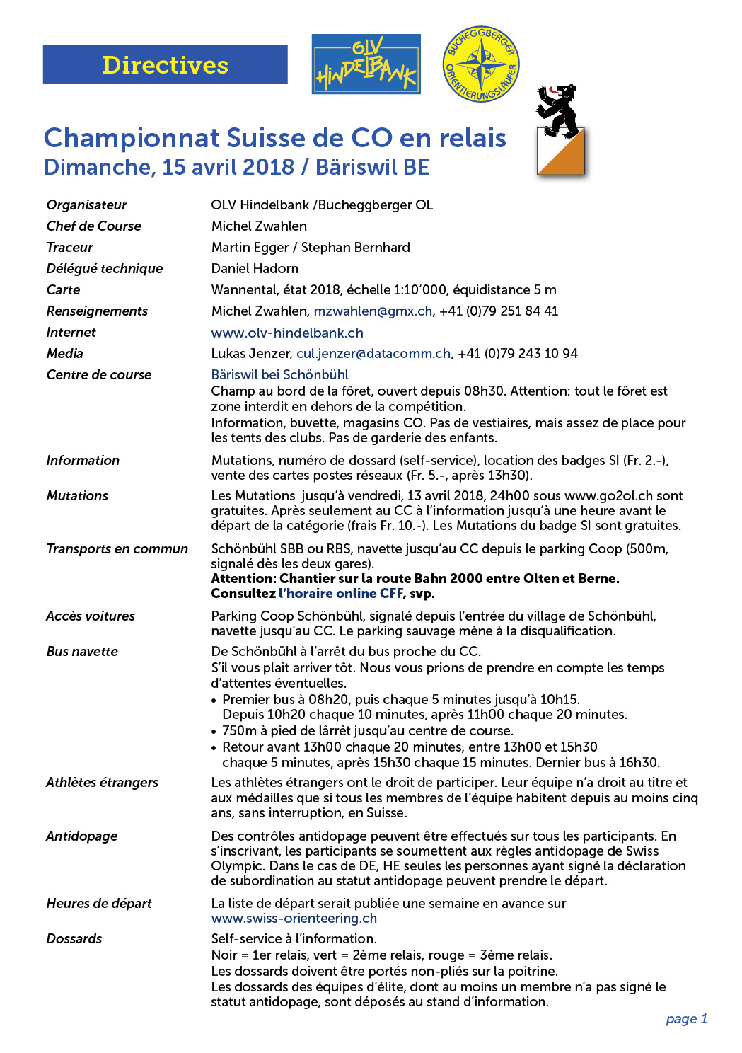 NEU: Directives FR (PDF) / Championnat Suisse de CO en relais / Dimanche, 15 avril 2018 / Bäriswil BE