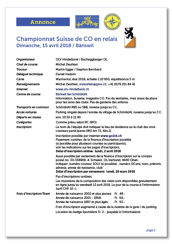 Annonce FR (PDF) / Championnat Suisse de CO en relais / Dimanche, 15 avril 2018 / Bäriswil BE