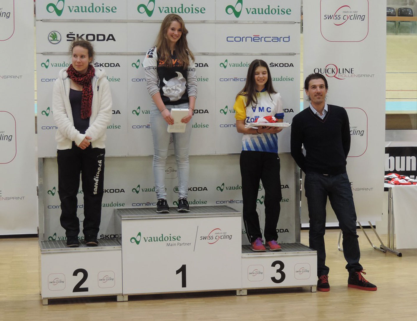 Nadia Jakob und Oliver Honggler (von unserer Trainingsgemeinschaft) konnten sich für das Finale des Quickline-Rollensprint im Velodrome in Grenchen qualifizieren. Mit Larissa Marty war noch eine weitere Biberisterin anwesend. Sie hat mit Nadia die Scool-Cups bestritten und war auch in diesem Jahr einmal am Training. Beim Final in Grenchen schaffte es nur Nadia unter die besten Vier. Sie stellte in ihrer Kategorie die schnellste Zeit auf (teilweise gegen mit Renntrickots voll ausgerüstete Konkurrentinnen). Doch es gab noch einen zweiten Durchgang für die besten Vier (obwohl eines der vier Velos nicht funktionierte und die Teilnehmerinnen nicht gegeneinander antreten konnten). Da Nadia in der Vorwoche krank war, verliessen sie ein wenig die Kräfte, wurde aber trotzdem gute Dritte. Mit bereits übersäuerten Beinen ging es anschliessend direkt auf die Bahn, wo ein Einführungstraining statt fand. Gemeinsam mit dem Maestro Fabian Cancellara, konnten die Runden gedreht werden. Er nahm sich sogar Zeit, persönliche Ratschläge zu erteilen. Im Rahmenprogramm konten noch andere Raddisziplinen getestet werden. So war Jana länger als eine Stunde am Kunstradfahren. Einen weiterer Höhepunkt bildete die Siegerehrung mit Fabian Cancellara.