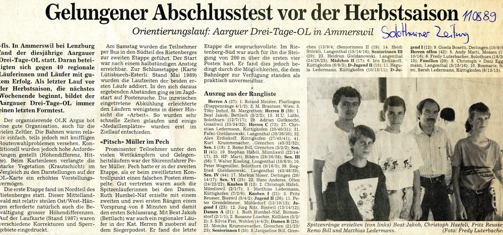 Die Schlagzeile in der Solothurner Zeitung vom 11.8.1989 (vor 25 Jahren!) hätte auch heute noch ihre Gültigkeit – der Aargauer 3-Tage OL ist immer noch ein guter Test für die kommende OL-Herbstsaison.