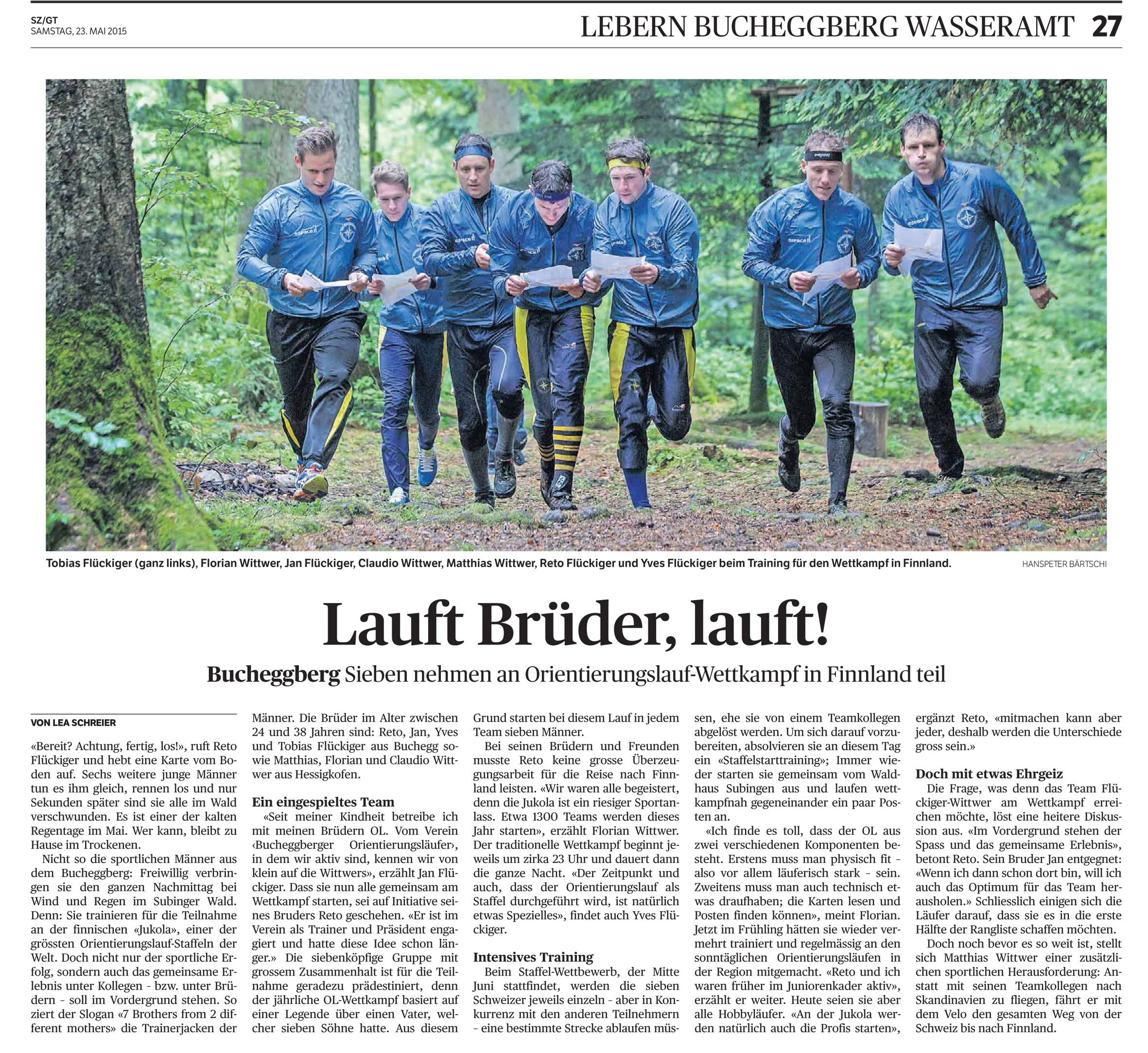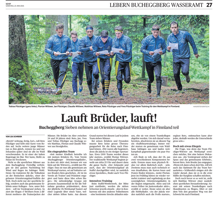 Nun ist auch der mediale Startschuss zum Projekt «7 Brothers from 2 different mothers – 7 Buechi-Brothers goes to Jukola» gefallen: in der heutigen Ausgabe der Solothurner Zeitung ist ein Artikel zum Flückiger-Wittwer-Jukola-Projekt erschienen; mit einem «epischen» Bild! Good luck boys!