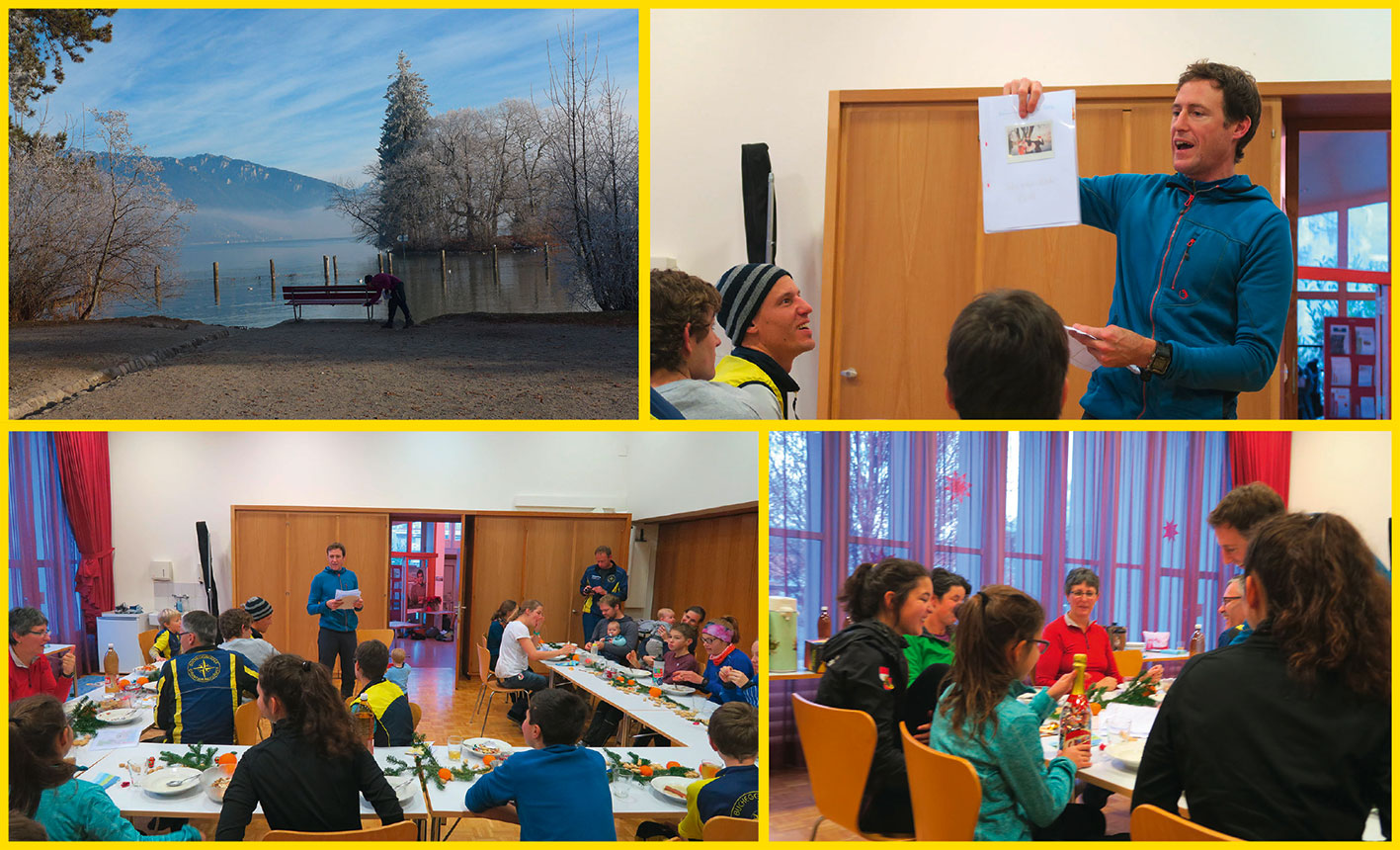Der erste Teil führte die (sportlichen) Teilnehmer in den Guntelsey-Wald. Dort musste auf einer Korridor-OL-Karte eine bestimmte Anzahl Posten gefunden werden... Biit hatte 3 Posten gestellt...und einige Buechis haben (zu Biits Erstaunen) 7 oder sogar 8 Posten gefunden!? Wie sich später heraustellte, waren diese 8 Posten der Grundstein zu einem überlegenen Grümscheler-Sieg. Dann folgte die gemütliche Route entlang des Thunersees – mit einem Scrabble-OL-Intermezzo – bei dem einige (inkl. der Autor dieses Berichts) wegen dem gesuchten (eigentlich einfachen) Lösungswort sehr stark ins Grübeln gekommen sind. Einer der Höhepunkte dieses Grümschelers war sicher die Samichlaus-Foto-Session am Ufer des Thunersees mit Sonnenschein und blauem Himmel – dieser Sonnenschein war Balsam auf die Seele für alle Nebel-geschädigten Bucheggberger! Das Armbrustschiessen am zweitletzten Posten war ein wenig Glücksache, da die Pfeile nicht immer kleben blieben – aber auch hier war das zukünftige Siegerteam natürlich sehr erfolgreich. Beim abschliessenden Wirrwarr-OL half einem das Glück aber überhaupt nicht weiter – hier war definitiv Köpfchen gefragt! Die gedrehten «Planquadrate» verdrehten einem gehörig den Kopf und führten dazu, dass man die Buechis mehr oder weniger kopflos bei der Postenjagd beobachten konnte. Hat überhaupt jemand den Wirrwarr-Sprint ohne Fehler geschafft? Egal – das Ziel war erreicht. Bei Suppe, Würstli + Brot (+ Nüssli + Schöggeli +...) warteten wir gespannt auf die Auswertung von Biit... und die Sieger sind (mit deutlichem Punkte-Vorsprung) das Jakob-Family-Team: mit Jana, Fabienne, Nadia + Regula – Herzliche Gratulation!
